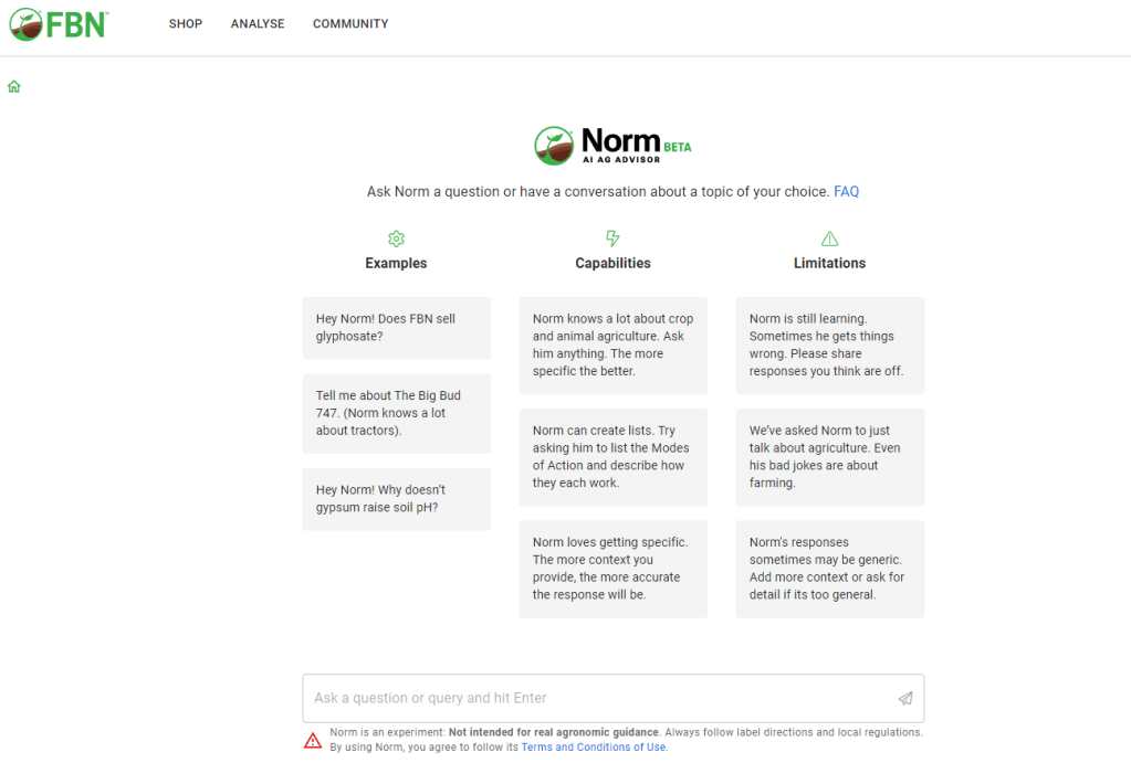 In the Farmer’s Business Network’s own words: Built off of ChatGPT’s language model, Norm is trained to provide high quality agronomy content.